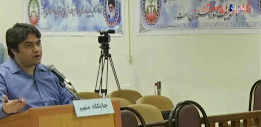 IRAN — Ruhollah Zam, a former opposition figure who had lived in exile in France and was implicated in anti-government protests, speaks in a courtroom during a trial, November 30, 2020