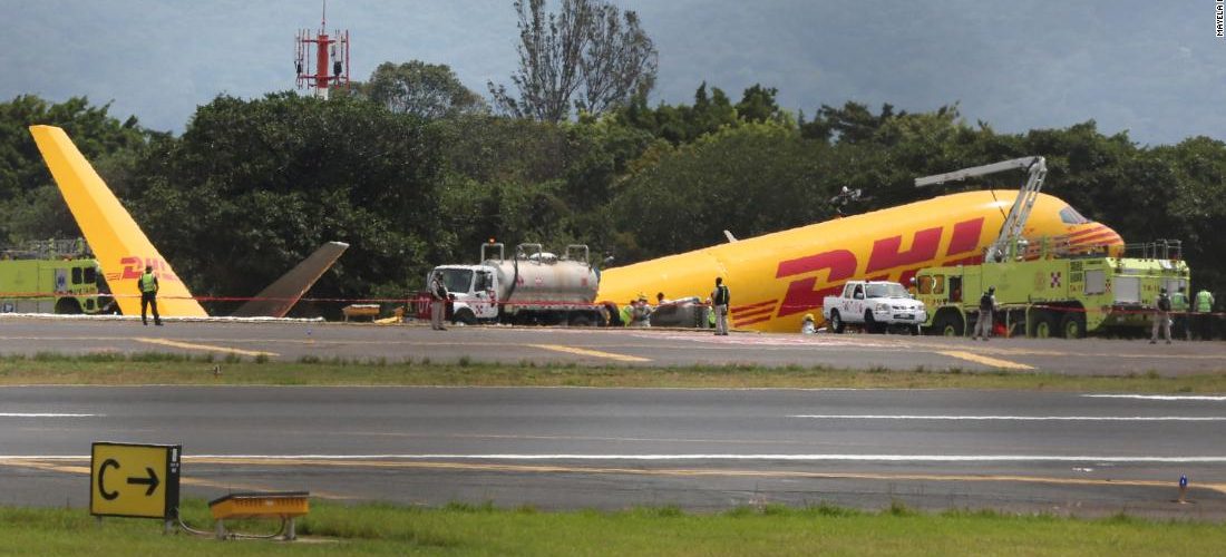Images from Costa Rican newspaper La Nacion showed a yellow plane emblazoned with the DHL logo being doused with firefighting foam where it had landed on a grassy field next to a runway. The tail had detached and a wing had broken, the photos show.