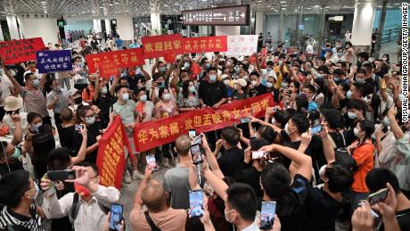 Inside the arrival hall, hundreds of people gathered to welcome Meng. Holding national flags, flowers and banners, the crowd erupted in national pride, shouting slogans including “long live the motherland” and belting out patriotic songs.