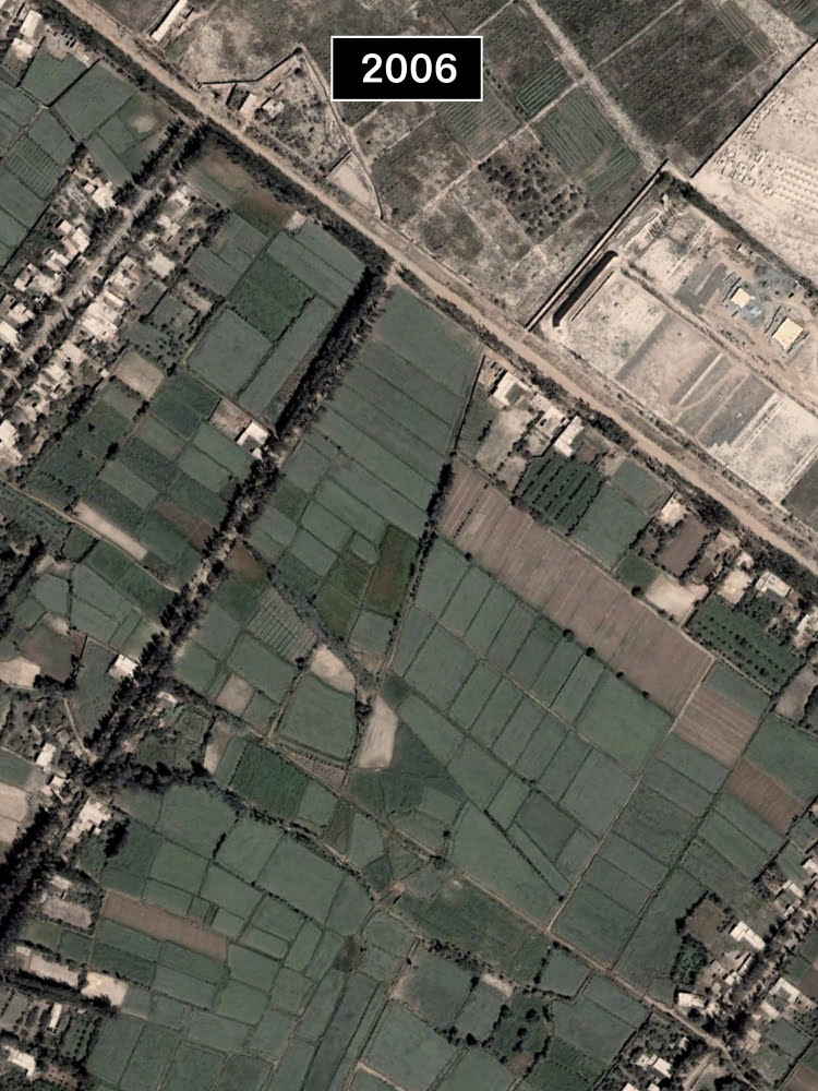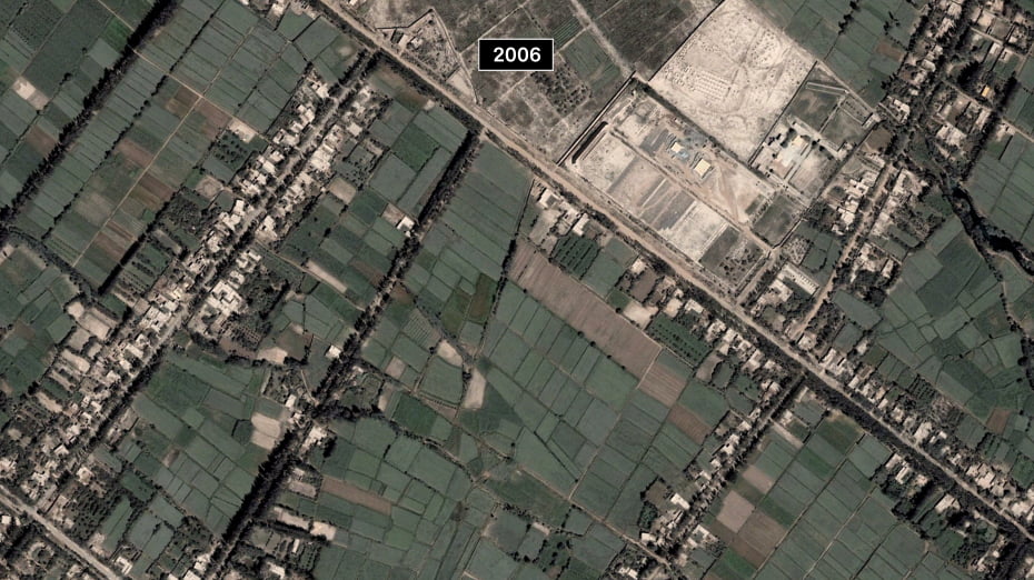 For example, the growth of a camp in Shufu County, around 7 kilometers (4.5 miles) from Amina Hojamet’s village, can be tracked via satellite imagery on Google Earth. The installation was first built around 2013, though it may have initially been used for another purpose. In the years since, it has more than doubled in size, and what appear to be watchtowers can be seen on walls around dormitory-like buildings, according to a review of historical satellite imagery.