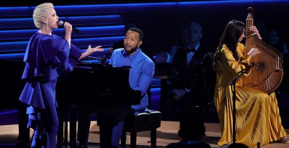 IMAGE SOURCE,GETTY IMAGES“Rain down freedom until we’re all free” sang Legend, who was also accompanied by a gospel choir, as images of those affected by the conflict played out on screens behind him.
