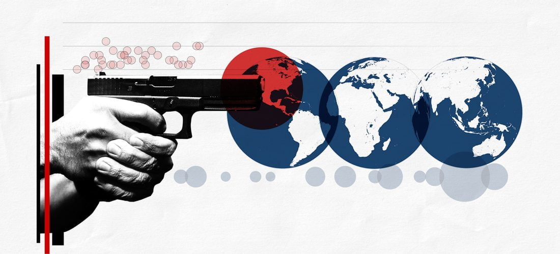 Note: Gun ownership rates are estimates as of 2017. Some entries have been combined to calculate rates for Cyprus, United Kingdom and Somalia. Data not available for Christmas Island, Nauru and Vatican City.