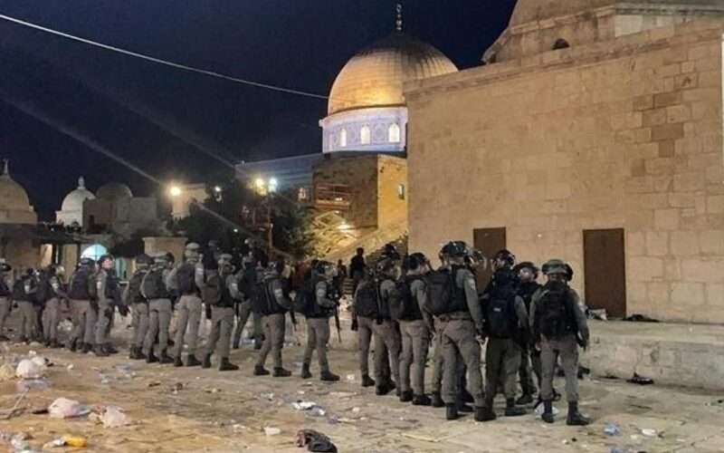 Dozens of heavily armed Israeli forces stormed the al-Aqsa Mosque compound on Tuesday night before firing tear gas and stun grenades into the Qibli prayer hall, where hundreds of men, women, elderly people and children were staying overnight to pray. Some eyewitnesses said rubber-coated steel bullets were also fired.