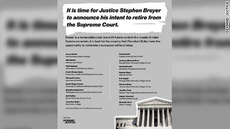 “Justice (Ruth Bader) Ginsburg’s death is really fresh in all of our minds. If Justice Breyer truly cares about protecting the legitimacy of the court, as he says he does, and his own judicial legacy, then the responsible thing for him to do is to step aside,” Tré Easton, a senior adviser for Battle Born Collective — a progressive strategy and advocacy organization — told CNN.