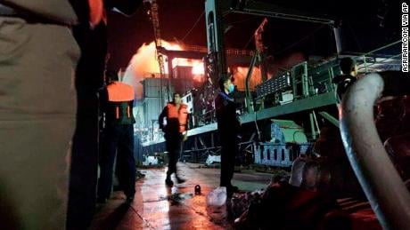 The blaze on board the huge training and logistical ship — called the “Khark” — began early Wednesday morning.