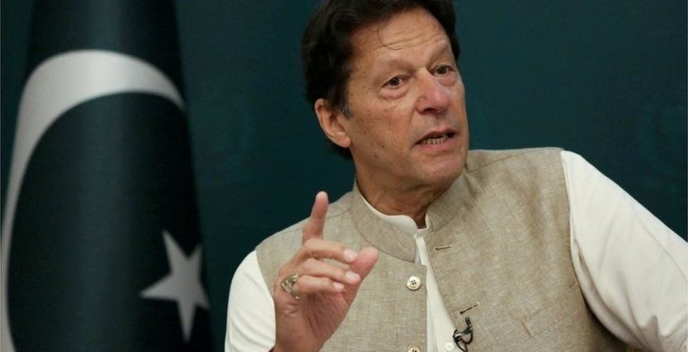 IMAGE SOURCE,EPAThundering against his arch-rivals – three-time premier Nawaz Sharif and Asif Zardari, husband of the murdered PM Benazir Bhutto – Mr Khan also waved a letter at the adoring crowd, alleging it contained evidence of a “foreign conspiracy” in cahoots with “corrupt thieves” aiming to topple his government.