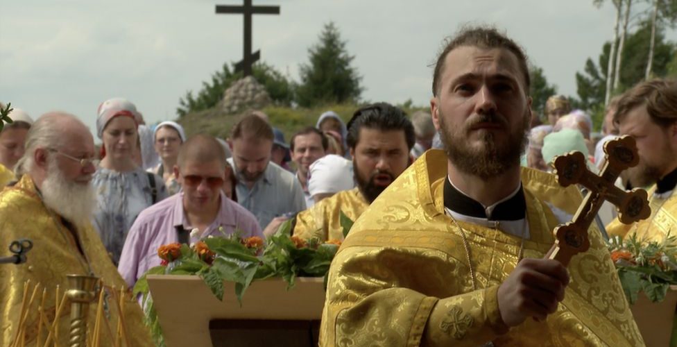 In the village of Vybuty, a large crowd has gathered outside a church. People are queuing up to kiss the icon of a saint.