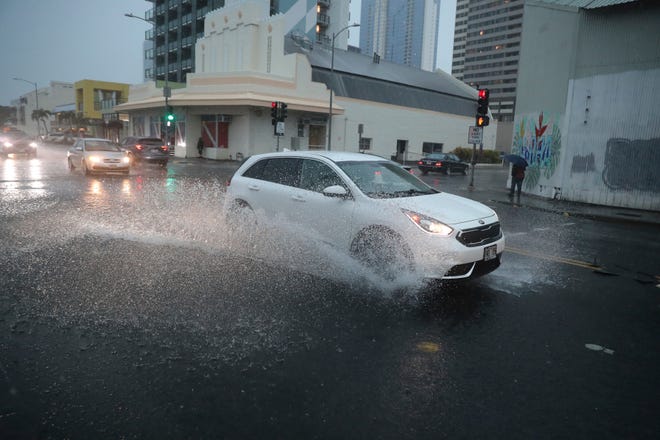 On Oahu, where four shelters had been opened, most of the beaches in Waikiki were empty Monday as only a few people walked with umbrellas during passing heavy showers. Roadways were flooding in the area and cars crept through downtown as water gushed out of manhole covers.