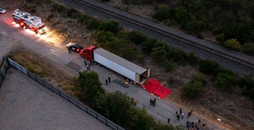 Emergency responders arrived at an isolated road near San Antonio on Monday evening to find 46 dead bodies inside and around the abandoned vehicle, which had its doors flung open.