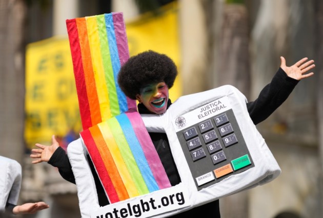 8 / 8An LGBTQ+ activist dressed as an electronic voting machine protests outside the Faculty of Law at Sao Paulo University in Sao Paulo, Brazil, Thursday, Aug. 11, 2022. (AP Photo/Andre Penner)