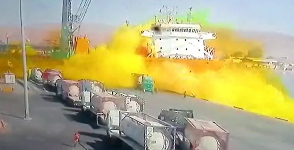 IMAGE SOURCE,AFPResidents of Aqaba city, which is 16km (10 miles) north of the port, were advised to stay inside and close windows and doors following the leak, which happened at 15:15 (12:15 GMT) on Monday.