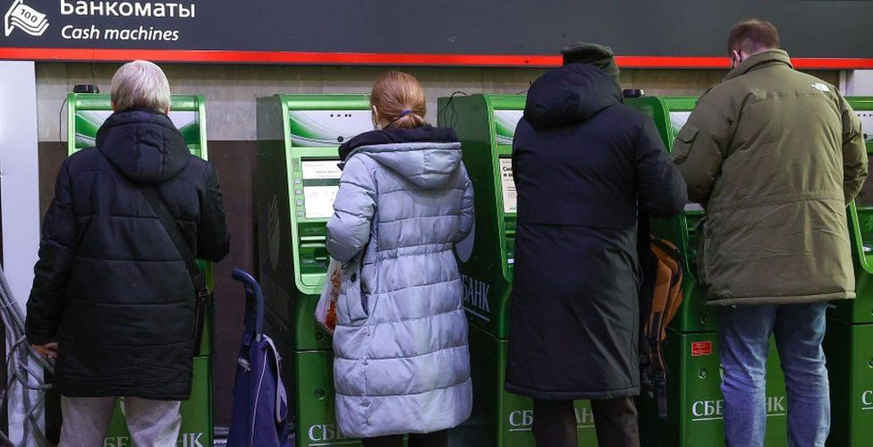 Videos on social media appeared to show long queues forming at cash machines and money exchanges in Moscow, worried that their bank cards may stop working or that limits will be placed on the amount of cash they can withdraw.